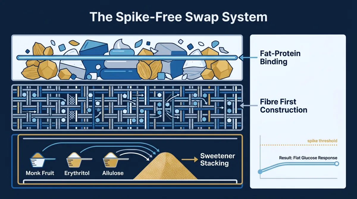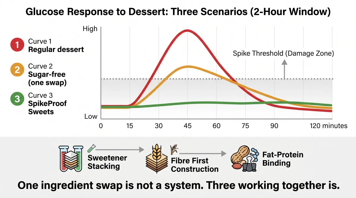 Because a single ingredient swap is not a system. Most sugar-free products use one sweetener with no fibre buffer and no fat-protein binding built in. Your body still processes it quickly and the spike still comes. SpikeProof Recipes uses all three techniques together, which is what actually keeps the glucose curve flat. The combination is the difference.
