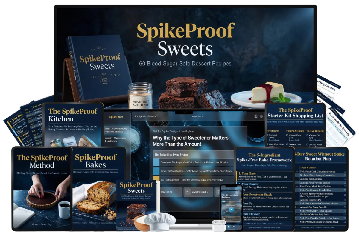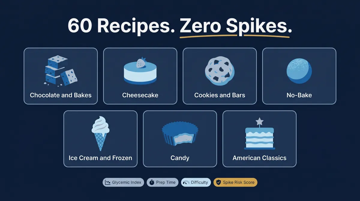 Instant Access to SpikeProof Recipes — 60 fully tested blood-sugar-safe dessert recipes built on the Spike-Free Swap System, with Spike Risk Scores, GI ratings, and prep times for every recipe (Value: $197)